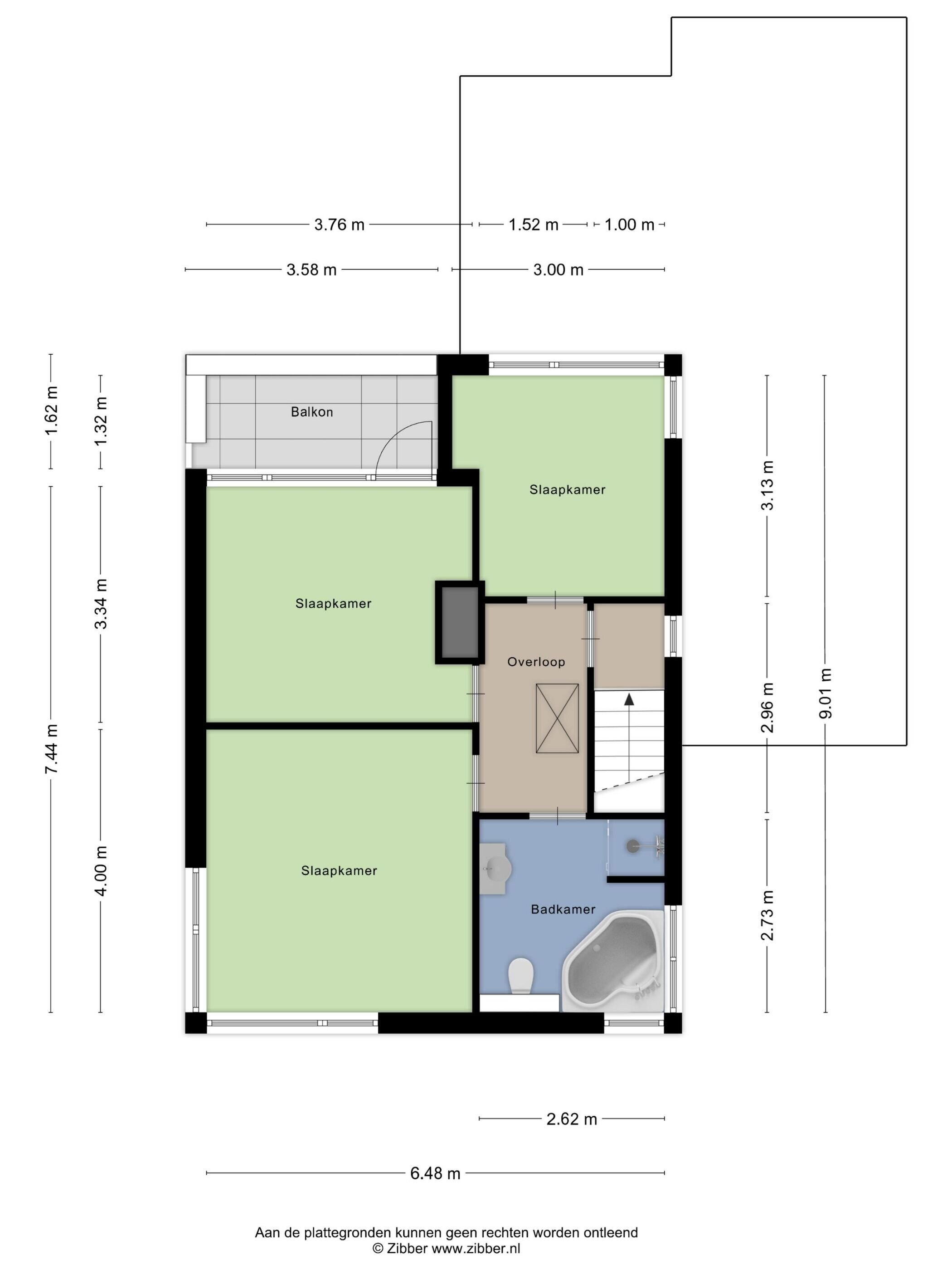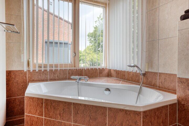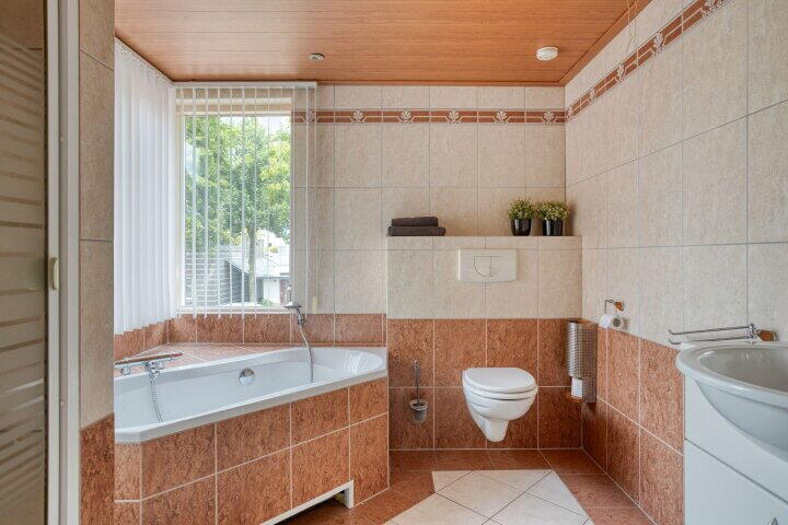Overloop met toegang tot drie slaapkamers, waarvan één met balkon. De badkamer is compleet uitgerust met een ligbad, aparte douchehoek, tweede toilet en een wastafelmeubel.